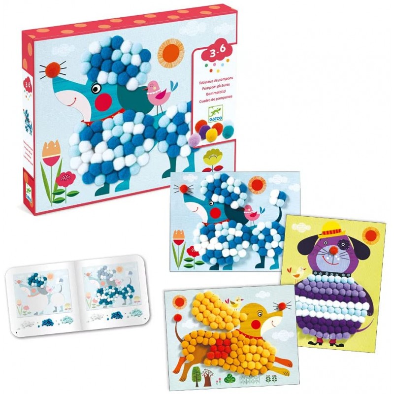 Cuadros de pompones, perros para acariciar, manualidades Djeco.