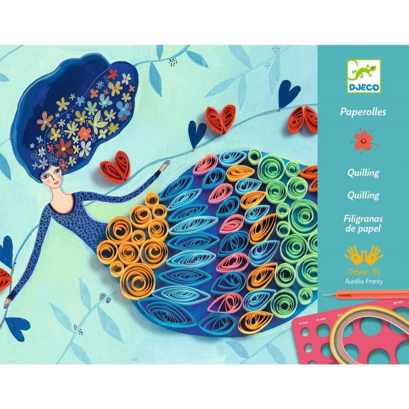 Contenido: 1 caja de almacenaje con cierre elástico, 2 tarjetas ilustradas (28x21cm), 1 surtido de tiras de papel de colores (40x0,5cm), 1 plancha de plantillas redondas, 1 plancha de plástico, 2 tubos de pegamento, 1 enrollador, 1 pinza, 1 folleto paso a paso a color.