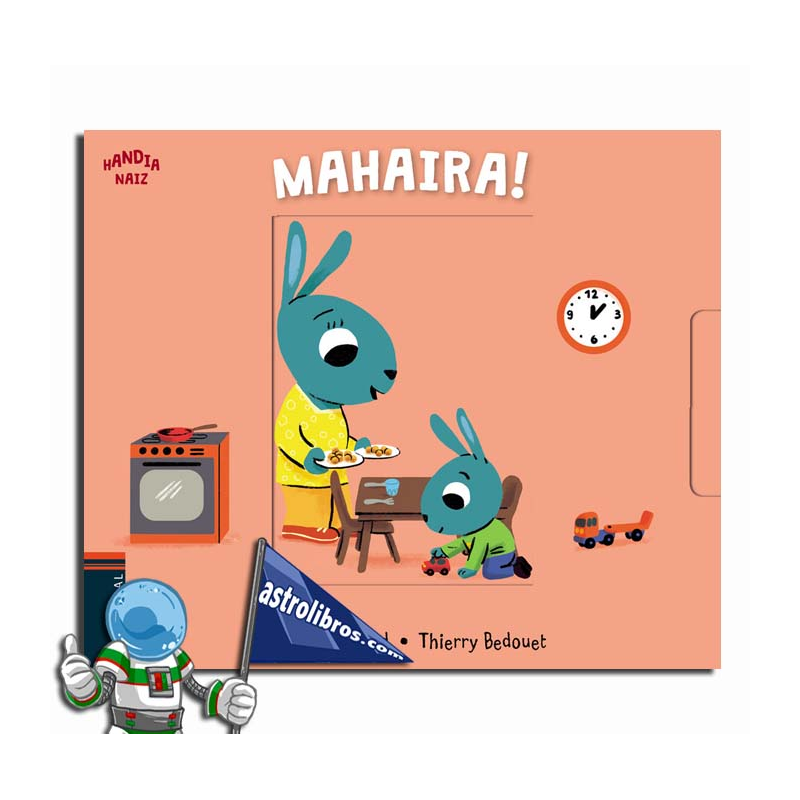 Libro de cartoné de la colección Handia naiz en euskera. Los pequeños cocodrilo, canguro, mono, oso y gato tienen que empezar a conocer los modales que hay que tener en la mesa mientras se come. Al tirar de la pestaña lateral, cambia la ilustración, por lo que cada doble página nos presenta dos escenas. Libro recomendado para niños y niñas a partir de 1 año.