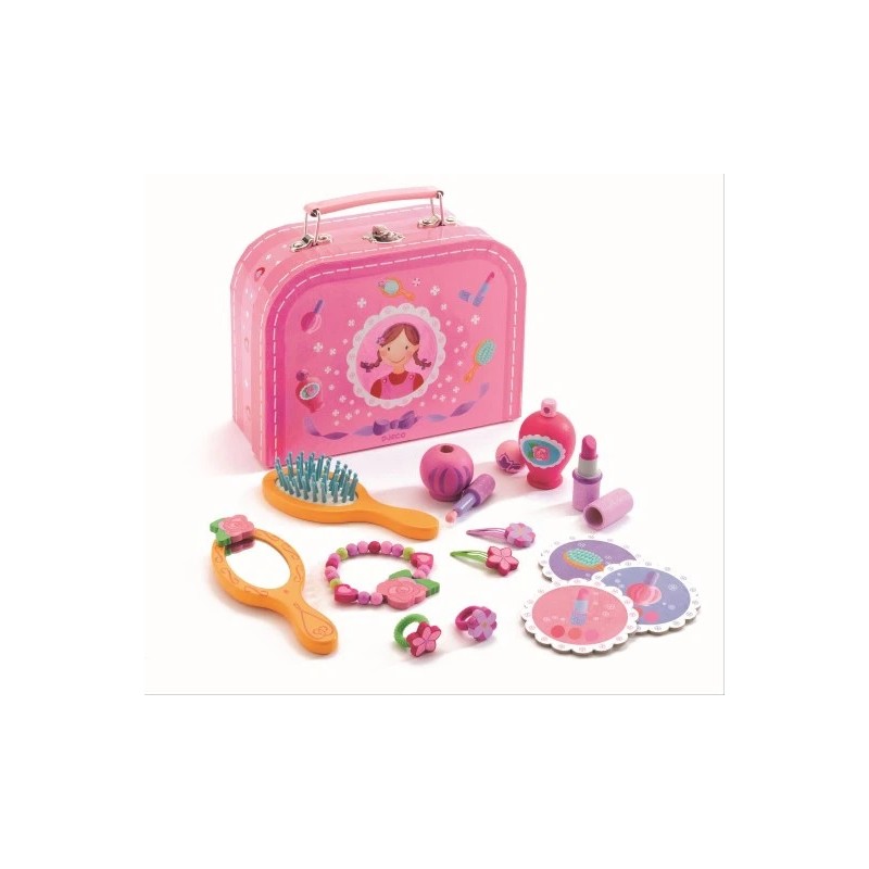 Contenido: 1 estuche de cartón asa que contiene 4 cartas de cartón y accesorios de madera: 1 pulsera, 2 gomas, 2 horquillas, 1 cepillo, 1 espejo, 1 perfume, 1 pintauñas y 1 pintalabios.