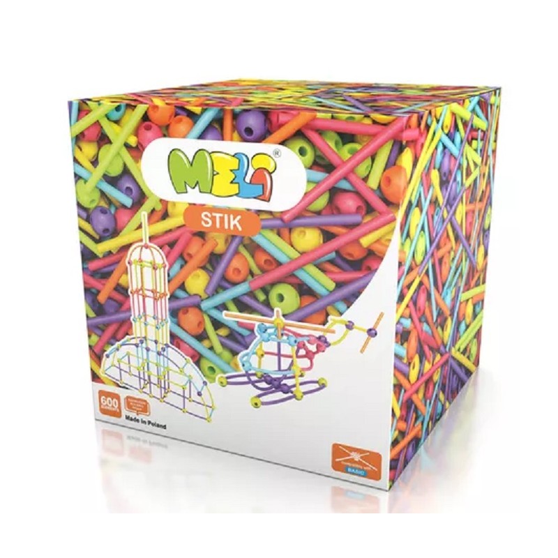Meli Stik son palitos flexibles hechos de plástico blando y completamente seguros que se pueden unir entre sí utilizando unas canicas especiales. Cada canica tiene 6 agujeros para unir las piezas en varios ángulos, lo que permite crear estructuras increíbles.