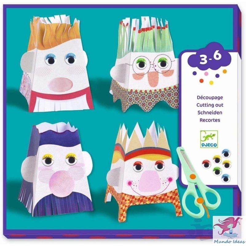 Incluye 12 plantillas para crear personajes, 1 tijera infantil y pegatinas para dar personalidad a los muñecos de papel.