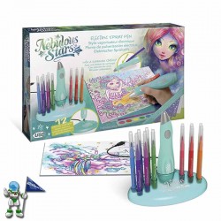 Incluye: 12 colores, 1 bolígrafo pulverizador, plantillas y pegatinas, 1 soporte y 1 USB.