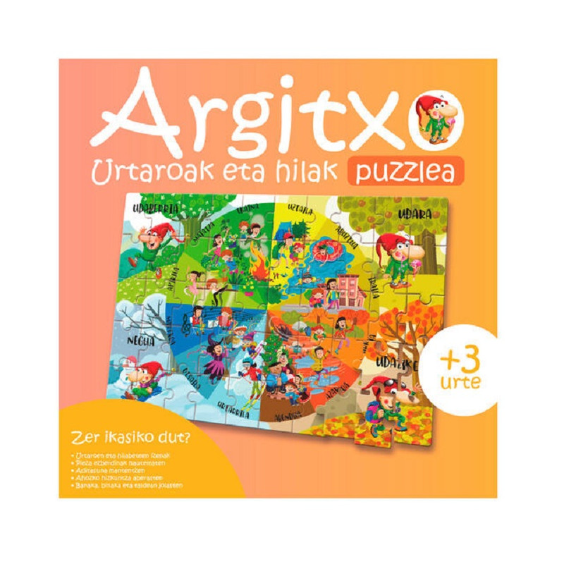 Urteko hilei eta urtaroei lotutako ekintza esanguratsuak islatzen dituen puzzlea. 50 zatiNeurria: 40 x28 cm 3 urtetik aurrera.