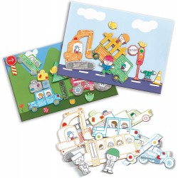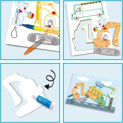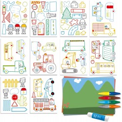 Un conjunto creativo sobre el tema de los vehículos. Una multitud de formas de cartón grueso para colorear y pegar en las 6 grandes decoraciones.