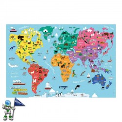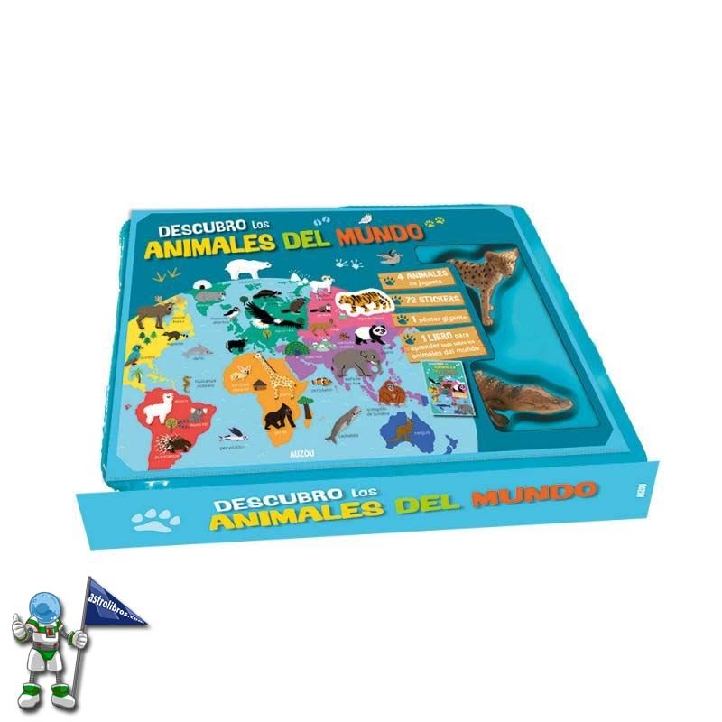 Una original caja que incluye un estupendo libro divulgativo que nos muestran animales de diferentes hábitats, agrupados por continentes, con información detallada de cada uno; un gran póster y pegatinas; cuatro figuras de animales.