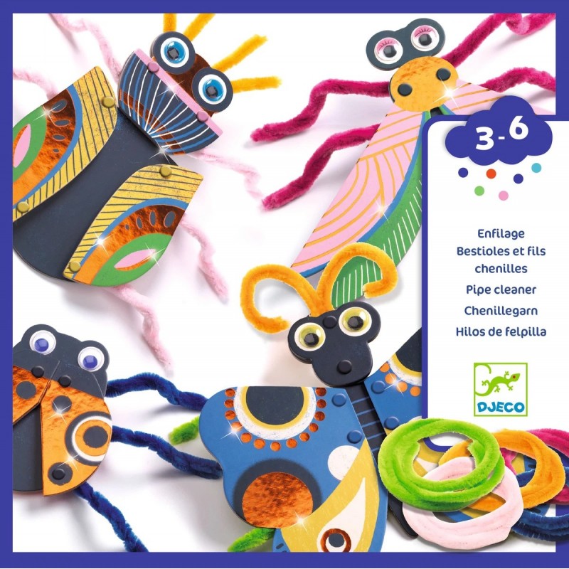 Una actividad de ensartado muy sencilla con hilos de felpilla para crear 4 «bichos» de colores.