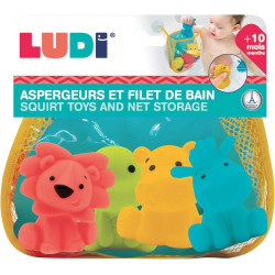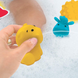 Este juego incluye 4 personajes con colores y formas de animales, además de una practica bolsita con ventosas para guardarlos y ponerlos en la bañera o en la pared del baño.