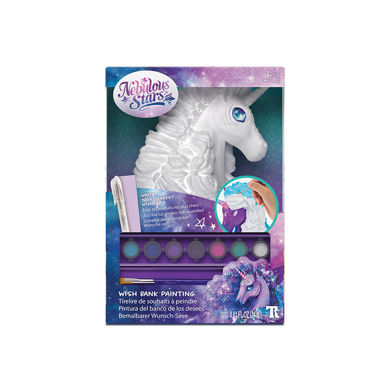 ¡Pinta una hucha de deseos única! Decora tu unicornio de Nebulous Stars con gemas y barniz con brillo.