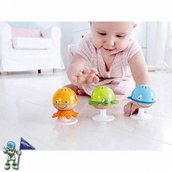 Divertidos sonajeros que se pegan en el suelo. Gracias a su ventosa los podremos adherir a cualquier superficie, el bebé deberá acercarse y tocarlo para que emita sonidos divertidos. Podemos hacer circuitos para la movilidad del bebé.