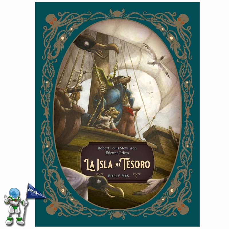 Libro ilustrado del clásico LaIsla de Tesoro editado por Edelvives. Esta conocida obra de Robert L. Stevenson ha sido ilustrada por Etienne Friess bajo la dirección artística de BenjaminLacombe. El joven artista ha convertido en animales humanizados a los protagonistas de una de las grandes novelas de formación juvenil, pionera de narraciones de piratas. Libro recomendado a partir de 10 años.