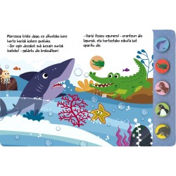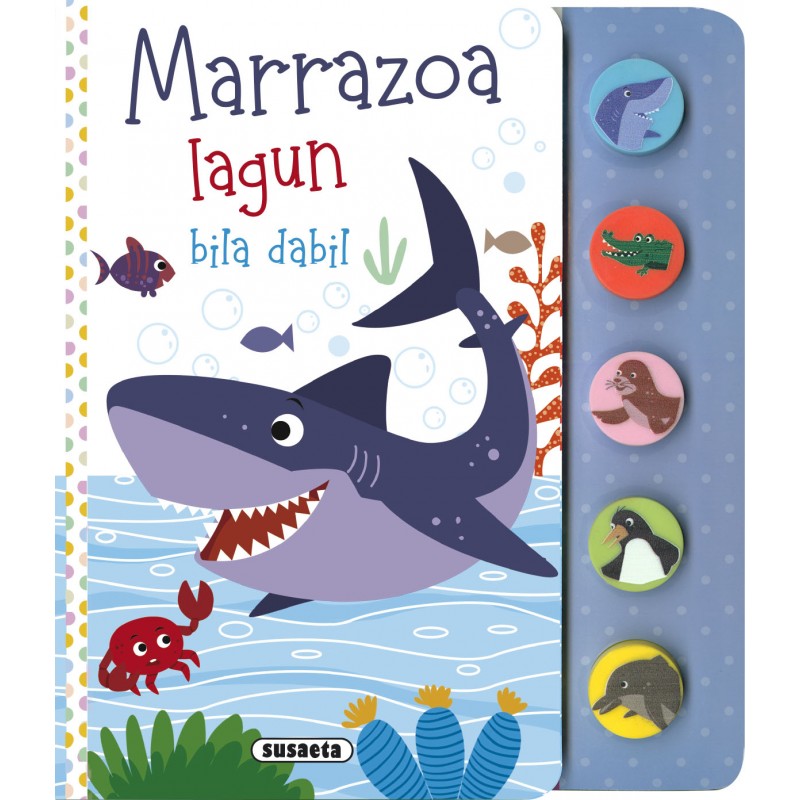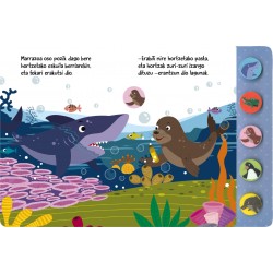 Edición en euskera del libro de sonidos editado por Susaeta, El tiburón hace amigos, de la colección Primeros sonidos de animales.