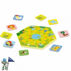 Un juego de memoria sonora para mejorar el oído y la asociación. El tablero hace sonidos de animales cuando pulsamos las flores, en cada partida los sonidos se reparten aleatoriamente. Las cartas de animalitos se colocan boca abajo, y cada vez que pulsamos en la flor tenemos que ser capaces de identificar qué animal y es y recordar dónde se encuentra su carta correspondiente. Gana el jugador que mejor oído y memoria tenga. Un juego sensorial perfecto para toda la familia.