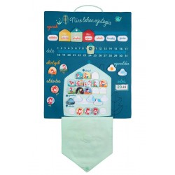 Contiene: Panel de tela con 3 marcadores para la semana (ayer, hoy y mañana), 1 marcador de fecha, 12 fichas ilustradas de actividades (más 1 en blanco para dibujar una nueva actividad), 6 fichas ilustradas de tiempo, 5 fichas ilustradas de estado de ánimo y 5 cartulinas para escribir el año.