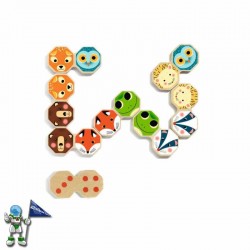 Precioso dominó con piezas hexagonales de animales. Muy bonito y fácil, el clásico dominó pero con forma hexagonal. Por una de las caras de las piezas podremos jugar con cantidades y por la otra relacionando animales o colores.