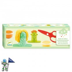 Juego de la marca Djeco. Con esta caja, su hijo se divertirá haciendo plastilina. Haga una bola, colóquela debajo de la cabeza del hombre, coloque al hombre sobre su base y presione para sacar el cabello. ¡usa las tijeras para hacer una taza pequeña! Una divertida caja para hacer herramientas para modelar el cabello que contienen herramientas, un par de tijeras y 2 frascos pequeños de pasta amarilla y naranja.