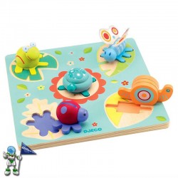 Primer encajable de DJECO de animales. Empezar a encajar piezas es un juego esencial para la maduración y las habilidades psicomotoras de los niños. Encaja cada figura en su hueco correspondiente y aprende los insectos. Tiene un soporte muy cómodo para que el niño pueda coger las piezas fácilmente con las manos.
