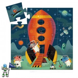 Un bonito puzzle de 16 piezas para niños presentado en una cajita con la forma troquelada de un cohete y con saturno.