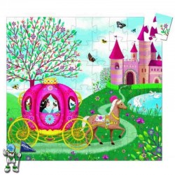 Un bonito puzzle de 54 piezas para niños presentado en una cajita con la forma de un carruaje de princesa.