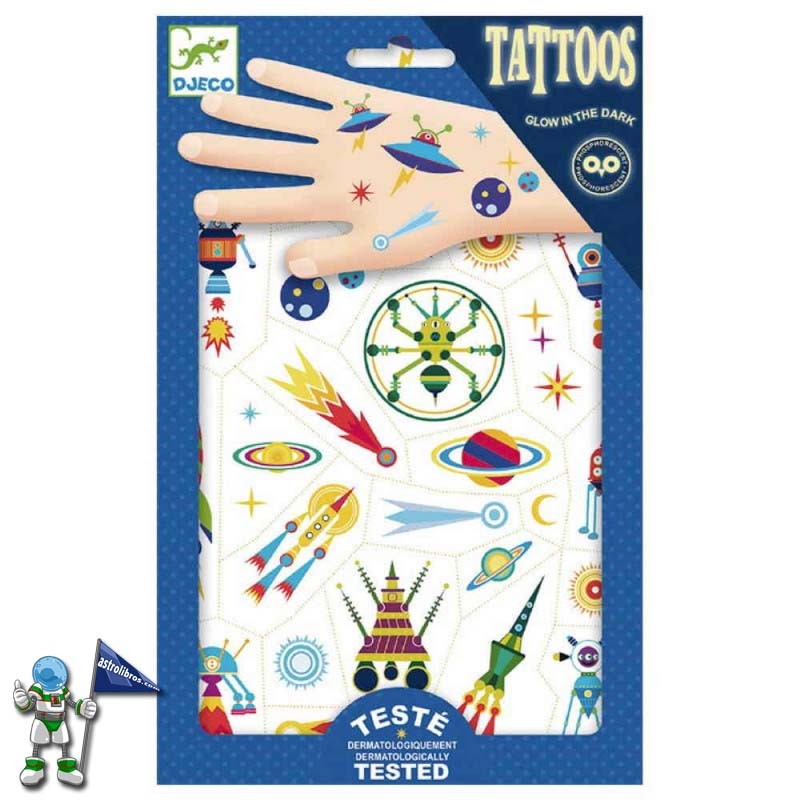 Decora tu cuerpo con un montón de calcomanías con motivos del espacio y que brillan en la oscuridad.