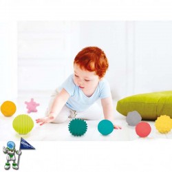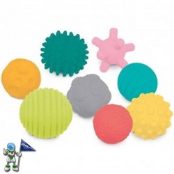 Jostailuak kolore, forma eta testura desberdineko 8 pilota ditu.