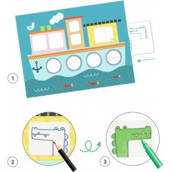 Contenido: 12 hojas ilustradas con calcos (28 x 21 cm), 15 tarjetas de calco (10 x 7 cm), 1 lápiz con goma de borrar, 4 rotuladores (amarillo, rosa, verde y azul) y 1 cuadernillo de explicaciones paso a paso.