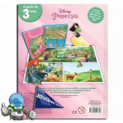 Un cuento en hojas de cartón con historias de las Pricesas Disney y doce figuritas de las princesas y personajes de su mundo.