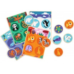 Hay que rellenar las cartas de distintos ecosistemas con las fichas de sus animales: El Polo Norte, la jungla, la sabana y el mar.
