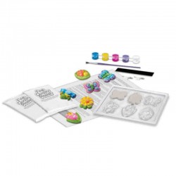 Pinturak (horia, berdea, gorria, zuria eta urdina), pintzela, igeltsua, 6 molde desberdinak.