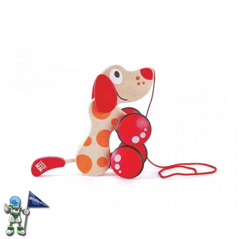 Arrastrador en forma de perrito, con diseño en madera natural con colores vivos.