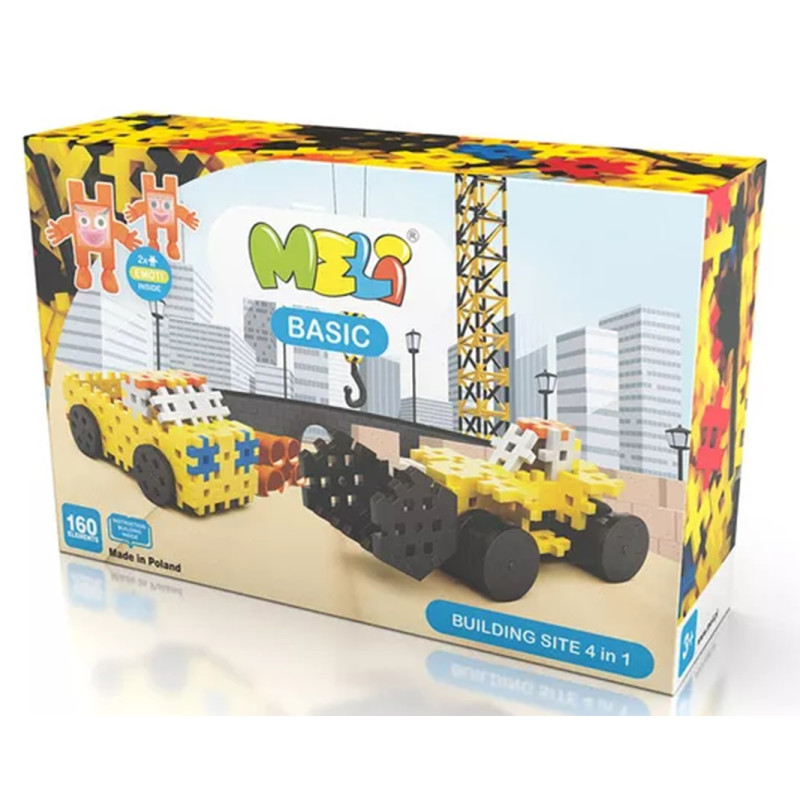 Os presentamos el conjunto MELI BUILDING SITE. Una excavadora, una apisonadora, una topadora y un camión esperan ser construidos. El folleto adjunto guiará a su hijo en su diversión de construcción.