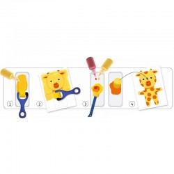 Trae todo el material necesario para que hagan sus creaciones artísticas usando rodillos, esponjas y pinturas lavables al agua para decorar escenas de simpáticos animalitos .