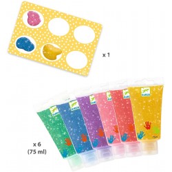 Contenido: 6 tubos grandes de pintura para dedos con purpurina (6 x 75 ml): rosa, dorado, azul, verde, morado, rojo. y 1 paleta.