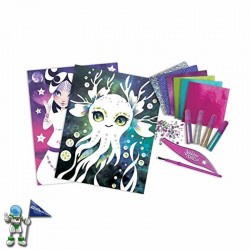 Dekoratzeko 3 xafla, 6 paper mota, purpurinazko 4 hodi, abalorioak (diamanteak), purpurina itsasteko erreminta eta pintzela, Mariniaren historia osoa, Jarraibideak.