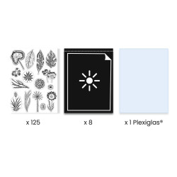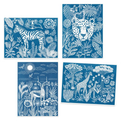 Con ayuda de unos motivos opacos, el niño crea escenas ilustradas sobre un papel fotosensible. Cuando el papel se expone al sol, los motivos se imprimen en negativo. ¡Basta con aclarar el papel en agua corriente para que las creaciones se revelen sobre un fondo azul!